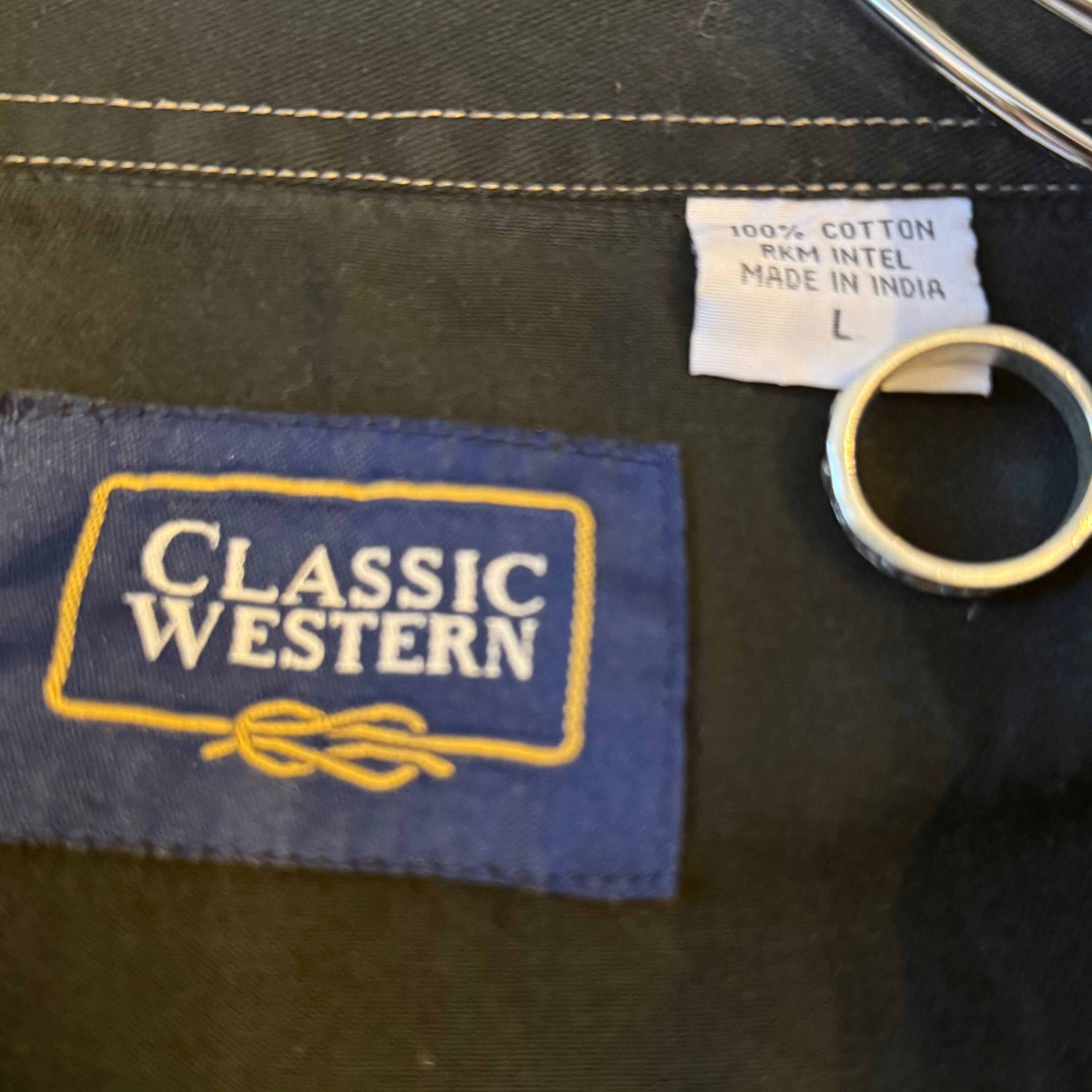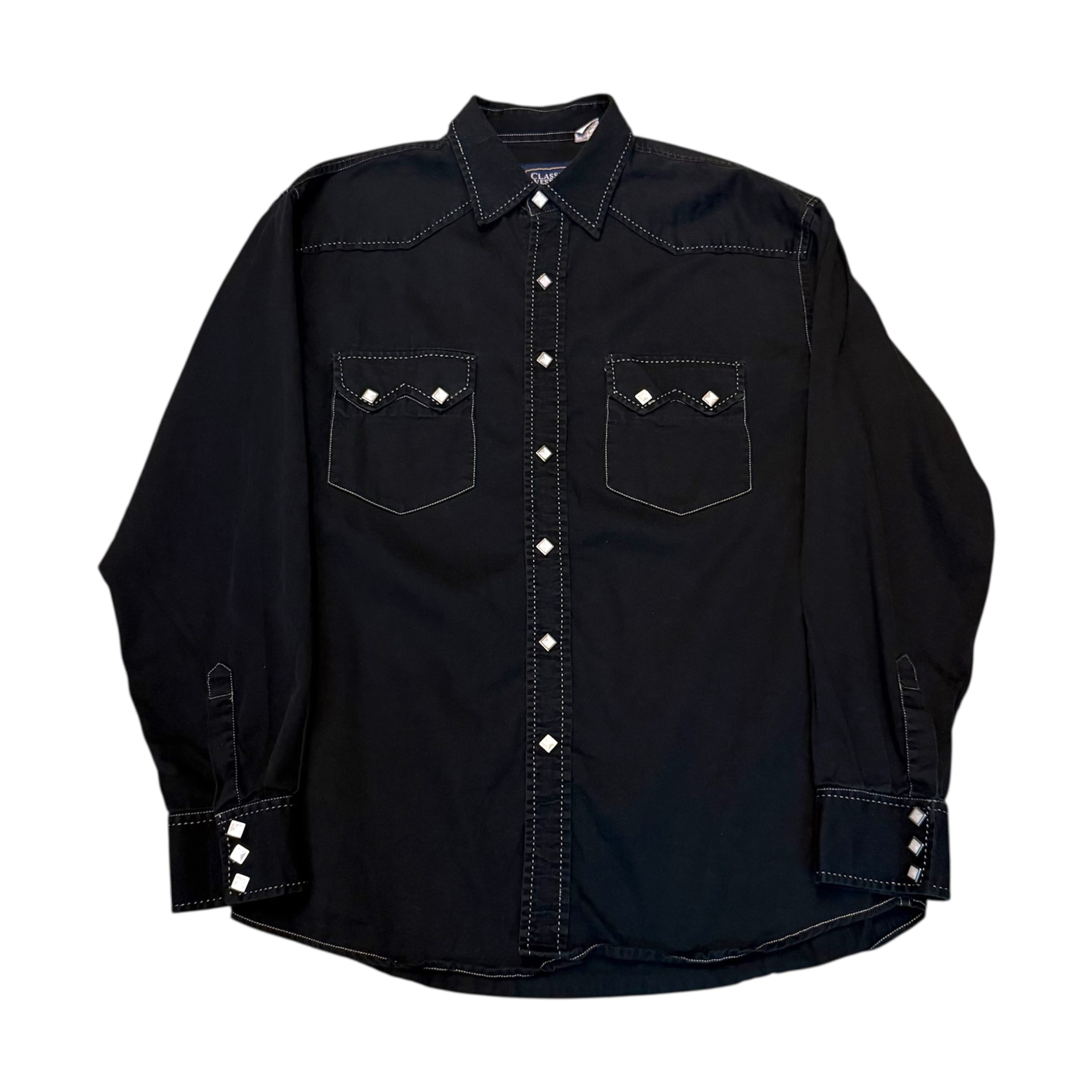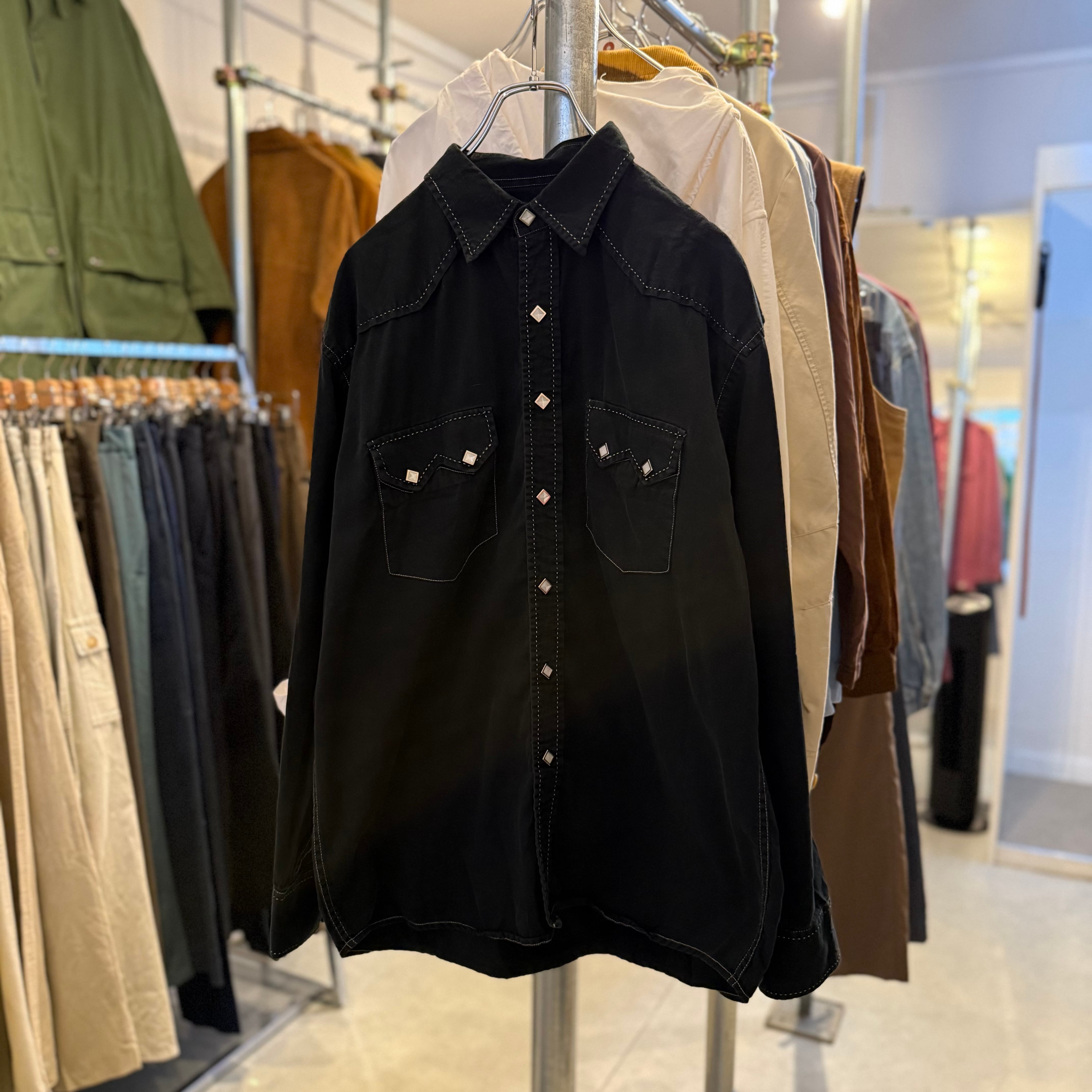 ブラックコーデに持ってきたいウエスタンシャツ。ホワイトのステッチがいい感じです。